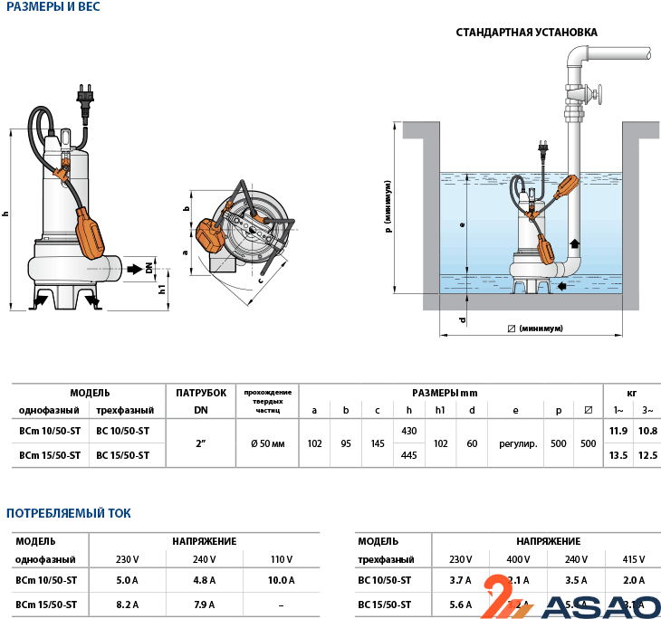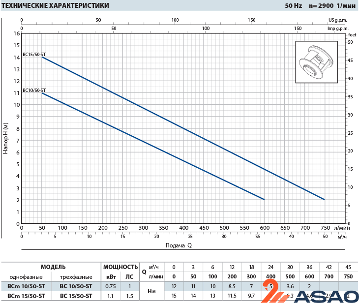 BC 15/50-ST (производительность - до 45 м?/час, напор - до 14 м, 380 В, 1,1 кВт)BCm 10/50-ST и BCm 15/50-ST - Однофазные версии серии, рассчитанные на напряжение 220 В при мощности 0,75 - 1,1 кВт