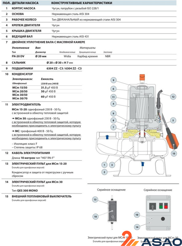 Керамика - графит - NBR со стороны двигателя. - ДВИГАТЕЛЬ: погружной, 2-х полюсной, с непрерывным режимом работы,