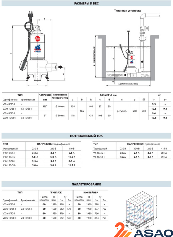 VX 10/35-I, VX 10/50-I - трехфазные версии серии, рассчитанные на напряжение 380 В при мощности 0,75 кВт