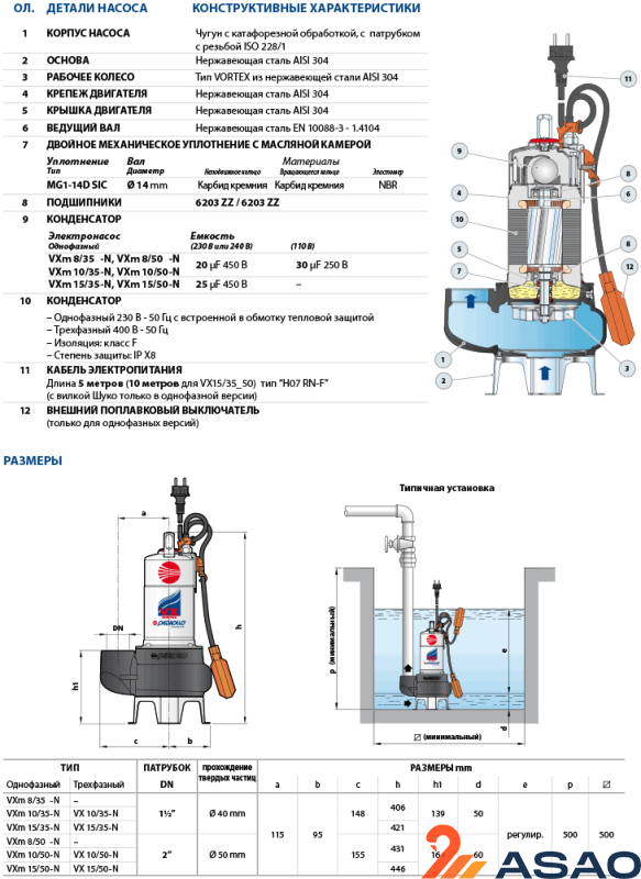 Погружной насос Pedrollo VXm 15/50-N применяется для отвода сильнозагрязненных стоков (в том числе нечистот), грунтовых вод с примесью ила и песка, осушения неглубоких колодцев, септиков, приямков.