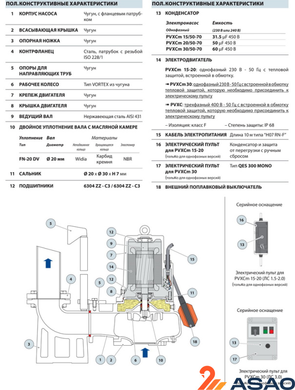 Керамика - графит - NBR со стороны двигателя. - ДВИГАТЕЛЬ: погружной, 2-х полюсной, с непрерывным режимом работы,