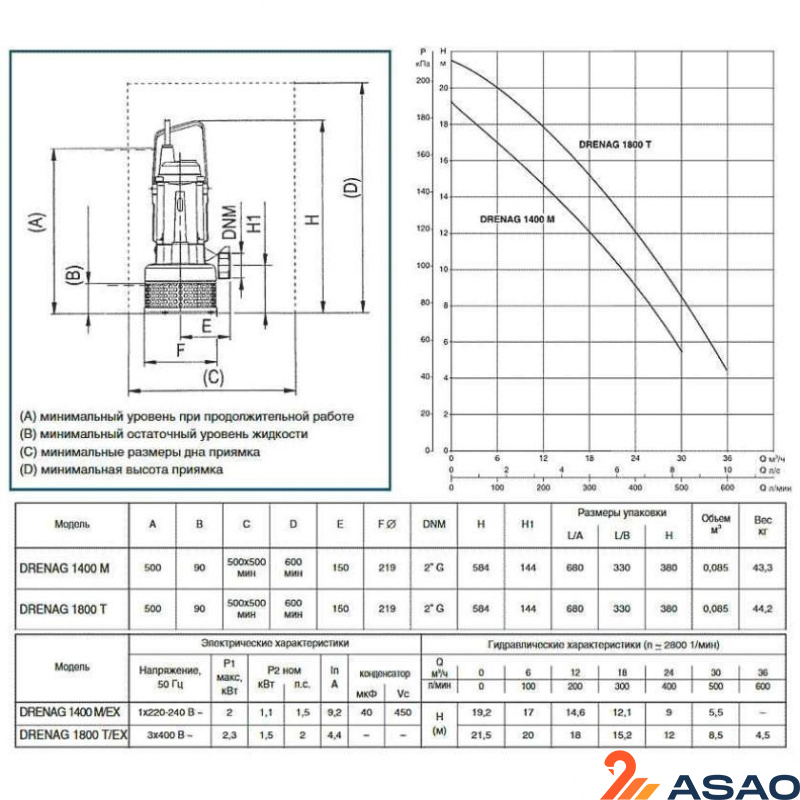Насос дренажный DAB DRENAG 1800 T - надежный и высокопроизводительный трехфазный, специально спроектированный для перекачки дренажных и сточных вод без длинноволокнистых включений с содержанием твердых частиц размером до 12 миллиметров, например, для перекачки грунтовой или дождевой воды, грязной воды на строительных площадках. Не предназначен для откачки стоков из туалетов.