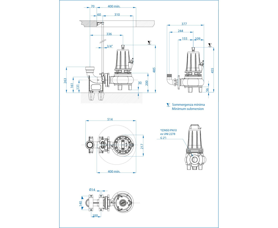 Благодаря хорошим эксплуатационным характеристикам и качеству сборки насосы Dreno DNA имеют долгий срок службы. Модель Dreno DNA 50-2/220-1 T имеет широкий проход твердых частиц до 50 мм. При мощности 2,2 кВт и напряжении 400 В. производительность насоса достигает 18 м3/час (300 л/мин) и напор 20,8 метров. Частота вращения насоса 2850 об./мин, максимальное количество пусков в час равно 15.