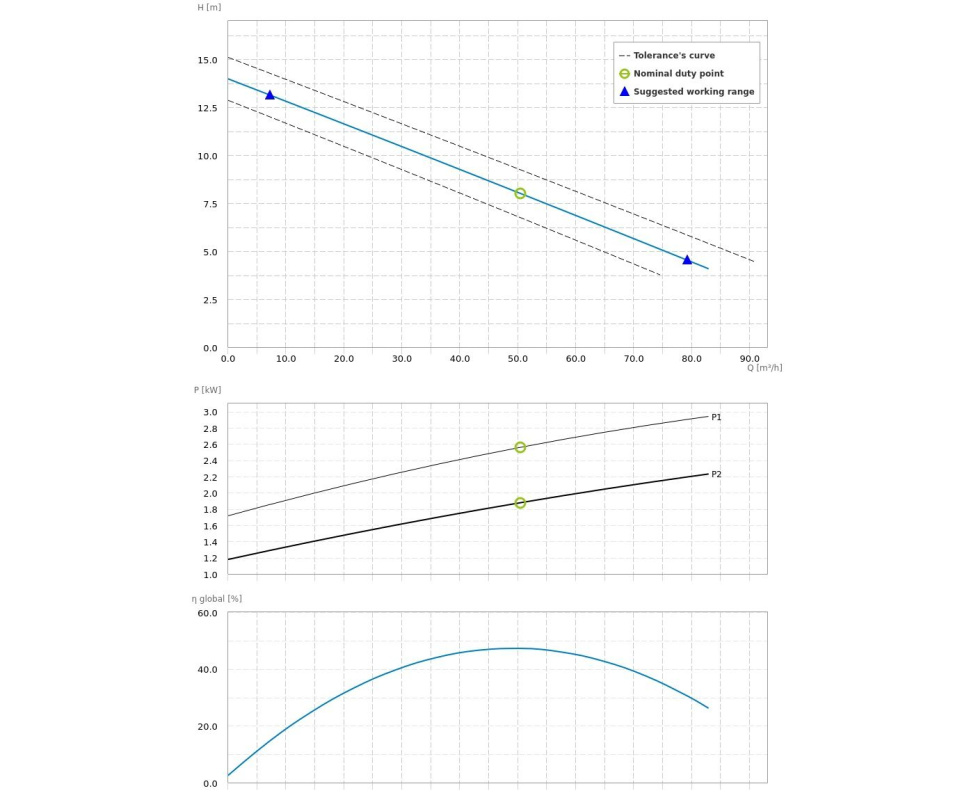 Благодаря хорошим эксплуатационным характеристикам и качеству сборки насосы Dreno DNB имеют долгий срок службы. Рабочее колесо S-Flow гарантирует высокую производительность на маломощных насосах. Модель Dreno DNB 80-2/220 T имеет широкий проход твердых частиц до 70 мм. При мощности 1,5 кВт и напряжении 400 В. производительность насоса достигает 90 м3/час (1500 л/мин) и напор 13 метров. Частота вращения насоса 2850 об./мин, максимальное количество пусков в час равно 15.