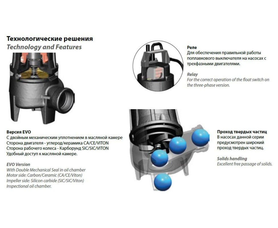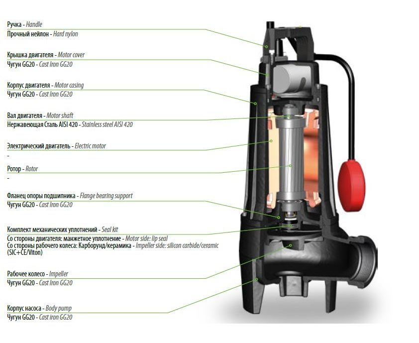 Конструкционные материалы погружного насоса прошли тщательный отбор для обеспечения долгой и надежной работы в тяжелых условиях эксплуатации. Крышка двигателя, корпус двигателя, промежуточный фланец, корпус насоса и рабочее колесо выполнены из чугуна. Комплект механических уплотнений: со стороны двигателя (манжетное уплотнение), со стороны рабочего колеса (карборунд/керамика).