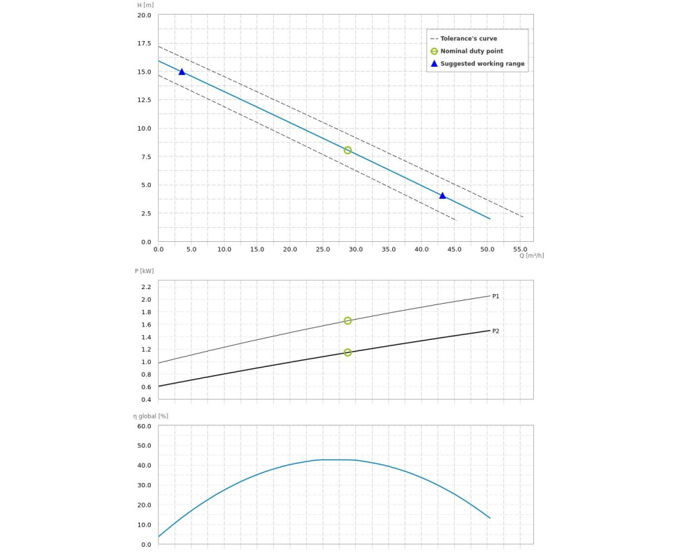 Благодаря хорошим эксплуатационным характеристикам и качеству сборки насосы Dreno DNB имеют долгий срок службы. Рабочее колесо S-Flow гарантирует высокую производительность на маломощных насосах. Модель Dreno DNB 65-2/150 T имеет широкий проход твердых частиц до 50 мм. При мощности 1,5 кВт и напряжении 400 В. производительность насоса достигает 50,4 м3/час (840 л/мин) и напор 15 метров. Частота вращения насоса 2850 об./мин, максимальное количество пусков в час равно 15.