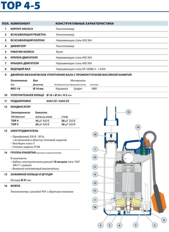 Насосы серии ТОР подходят для дренажа чистой, без абразивных частиц, воды. Применённые конструктивные решения обеспечивают простоту в эксплуатации и безопасность функционирования насоса, благодаря полному охлаждению двига- теля и двойному механическому уплотнению вала.