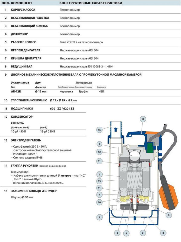 Характеристиками новых электронасосов ТОР VORTEX являются: дизайн, технология и новаторские материалы, которые обеспечивают простоту в эксплуатации и безопасность функционирования. Эта модель, благодаря испытанной системе VORTEX, позволяет подъем загрязненных вод с твердыми частицами во взвешенном состоянии без какой-либо опасности засорения рабочего колеса.
