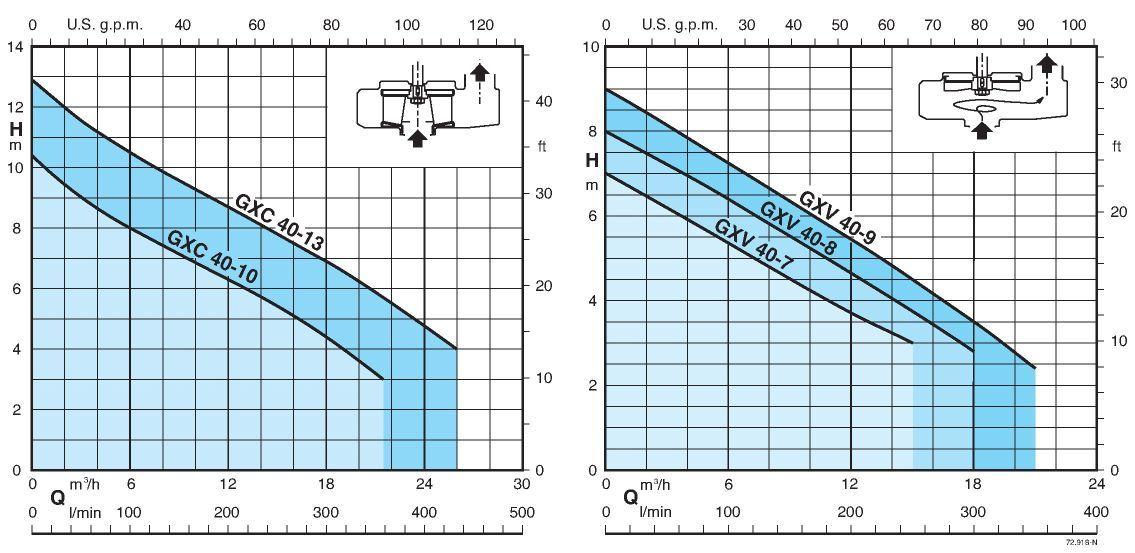 Насос Calpeda GXV 40-7 имеет непревзойденную надёжность и предназначен для функционирования при сложных условиях эксплуатации. Насос перекачивает отходы промышленных и сельскохозяйственных объектов, осушает помещения, которые были затоплены и наводнены. Оборудование позволяет забирать воду из природных водоёмов, резервуаров и скважин. Насос подходит для эксплуатации в режиме 24/7. Насос Calpeda GXV 40-7 оснащен поплавковым выключателем, что позволяет осуществлять запуск и остановку в автоматическом режиме. Основные части насоса выполнены из нержавеющей хромоникелевой стали исключает появление коррозии и механические повреждения. Двигатель охлаждается жидкостью, которая проходит через внутренний и наружный кожух, что обеспечивает охлаждение на высоком уровне и позволяет увеличить рабочий ресурс оборудования. Вал исполнен с двойным торцевым уплотнением. Поплавок насоса Calpeda GXV 40-7 поддается регулировке, поэтому вы можете задать уровень запуска и остановки оборудования. Подающий патрубок имеет вертикальное расположение, поэтому при установке насоса в небольшие скважины он направлен вверх и это исключает надобность использования коленчатого патрубка. Возможны специальные исполнения с другим напряжением и частотой, другими механическими торцевыми уплотнениями, длиной кабеля в 20 метров, с фиксированным (магнитным) поплавковым выключателем, а также трехфазное исполнение со встроенным поплавковым выключателем. Мощность насоса Calpeda GXV 40-7 составляет 0.55 кВт, а напряжение — 380В В. Насос обеспечивает напор от 3 до 6.2 м, производительность — от 3 до 15 м³/ч.Область применения