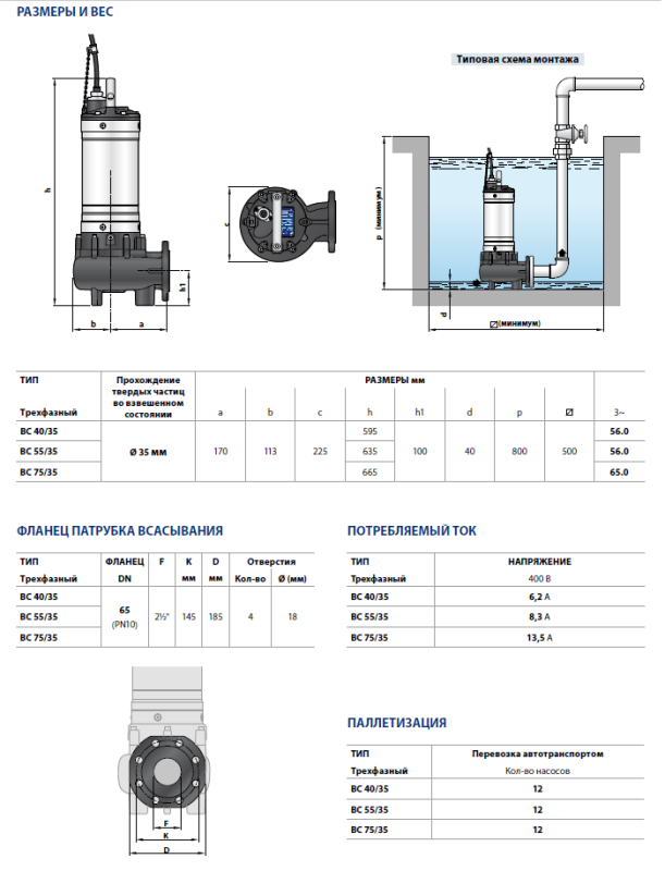 - Максимальное прохождение твердых частиц во взвешенном состоянии до d=35 мм