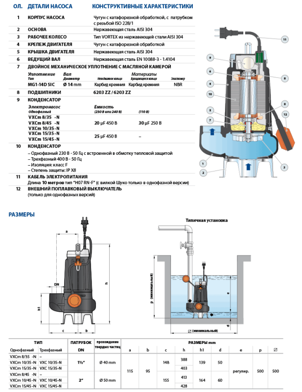 лубина погружения: до 10 м (при условии достаточно длинного силового кабеля) Максимальная температура жидкости до +40 °C Прохождение твердых взвешенных частиц: – до Ø 40 мм для моделей VXC /35-N – до Ø 50 мм для моделей VXC /45-N Минимальная глубина погружения для продолжительного режима работы: – 280 мм для VXC /35-N – 300 мм для VXC /45-N РАБОЧИЙ ДИАПАЗОН