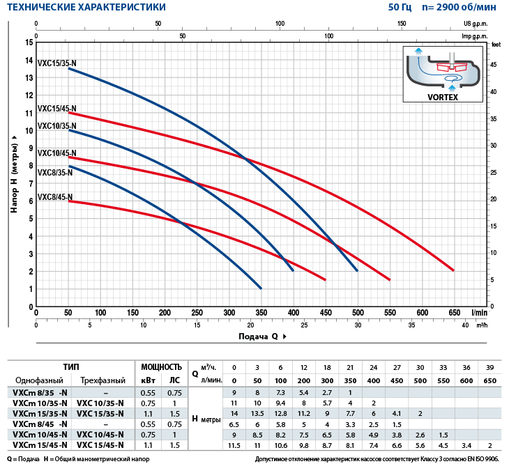 лубина погружения: до 10 м (при условии достаточно длинного силового кабеля) Максимальная температура жидкости до +40 °C Прохождение твердых взвешенных частиц: – до Ø 40 мм для моделей VXC /35-N – до Ø 50 мм для моделей VXC /45-N Минимальная глубина погружения для продолжительного режима работы: – 280 мм для VXC /35-N – 300 мм для VXC /45-N