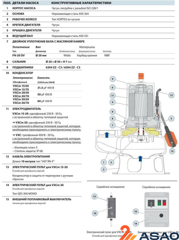 Погружные фекальные насосы VORTEX серии VXC, разработаны для откачки загрязненных и сточных вод, как в бытовой, так и в промышленной области. Электронасосы VXC оснащены открытым рабочим колесом, работающим по принципу жидкостного вихря. Рабочее колесо размещается в просторной кольцевой камере, защищенной корпусом насоса и нижним основанием, которое, препятствует прохождению твердых частиц диаметром, превышающим. Рабочее колесо вращает жидкость, находящуюся в корпусе насоса, создавая вихрь, который передает кинетическую энергию жидкости, выталкивая ее из нагнетательного патрубка, и всасывая новую жидкость из кругового прохода, предусмотренного в нижнем основании. Таким образом, удается передать энергию жидкости без необходимости ее проведения по узким каналам, задаваемым лопаткой рабочего колеса, а также обеспечить прохождение твердых частиц во взвешенном состоянии с присутствием удлиненных волокнистых тел, без опасности закупорки.