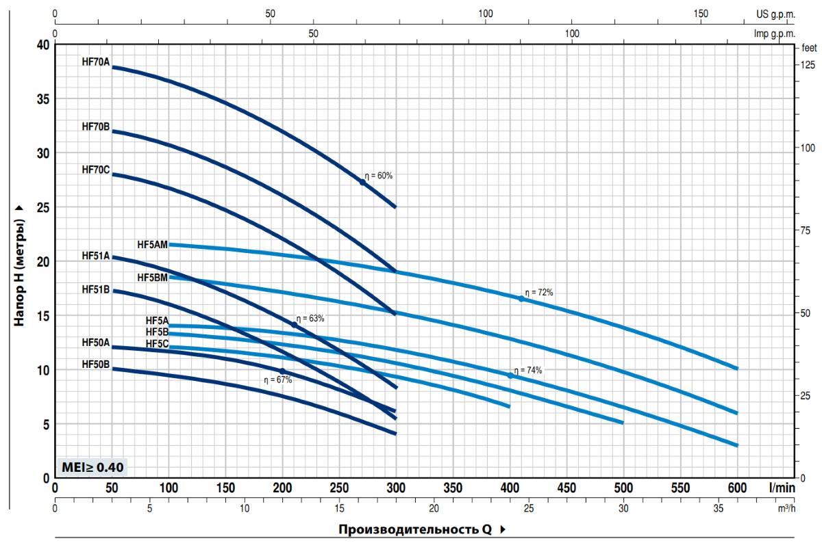 Серия насоса HF включает в себя электронасосы центробежного типа с одним рабочим колесом, разработанные для достижения высоких показателей подачи при средней и низкой величине напора. Рабочее колесо, качающееся на ведущем валу, находится прямо перед всасывающим патрубком, предусмотренного на корпусе насоса. Особая форма рабочего колеса обеспечивает при минимальных гидравлических потерях, радиальное движение жидкости по направлению от центра к периферии, в процессе которого лопасти, имеющиеся внутри канала рабочего колеса, передают энергию накачиваемой жидкости как в виде давления, так и в виде увеличения скорости потока. На выходе из рабочего колеса жидкость устремляется в спираль, которая, совместно с коническим диффузором, обеспечивает преобразование части кинетической энергии в энергию напора.